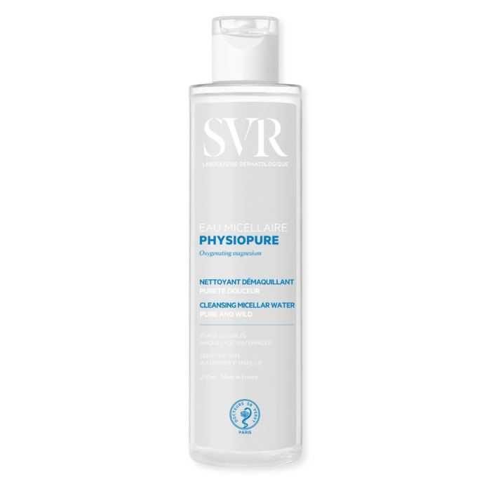 SVR PHYSIOPURE Eau Micellaire. L’eau micellaire Physiopure au magnésium oxygénant est une eau nettoyante, démaquillante et pureté douceur pour les peaux sensibles. L’eau micellaire démaquille et nettoie en un seul geste. Elle élimine efficacement les impuretés pour une peau nette et oxygénée. Sa formule est adaptée pour retirer tous les maquillages, même waterproof, du visage, des yeux et des lèvres. pH physiologique et parfum agréable. Sans alcool. Sans savon. Sans paraben.