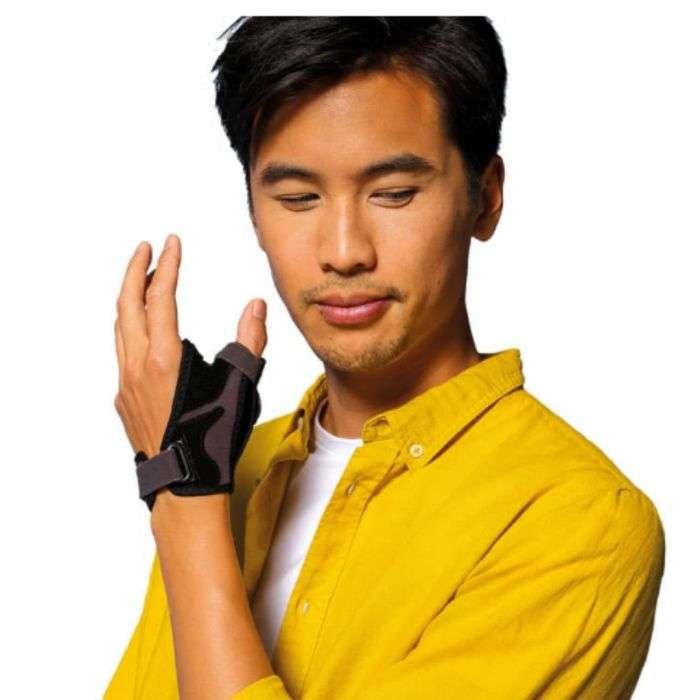 • Immobilisation du pouce en position antalgique par une armature en fil métallique brevetée